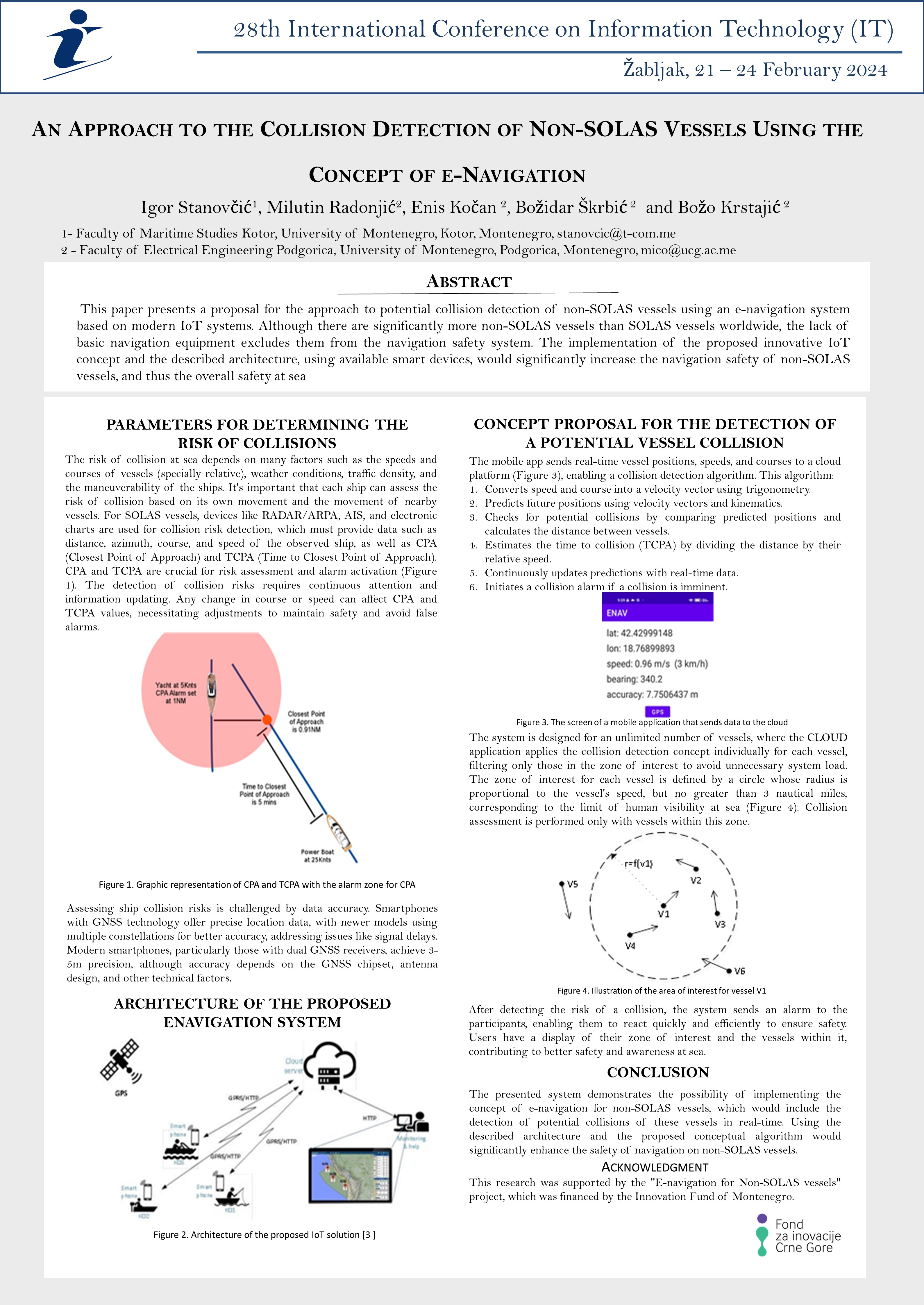 Rad pod nazivom “An Approach to the Collision Detection of Non-SOLAS Vessels Using the Concept of e-Navigation”, autora Igora Stanovčića, Milutina Radonjića, Enisa Kočana, Božidara Škrbića i Boža Krstajića, koji je nastao kao rezultat rada na ENAV projektu, prihvaćen je za objavljivanje na 28. međunarodnoj naučno-stručnoj konferenciji Informacione tehnologije 2024 (IT2024), koja će biti održana na Žabljaku u periodu 21-24. februara 2024. godine.